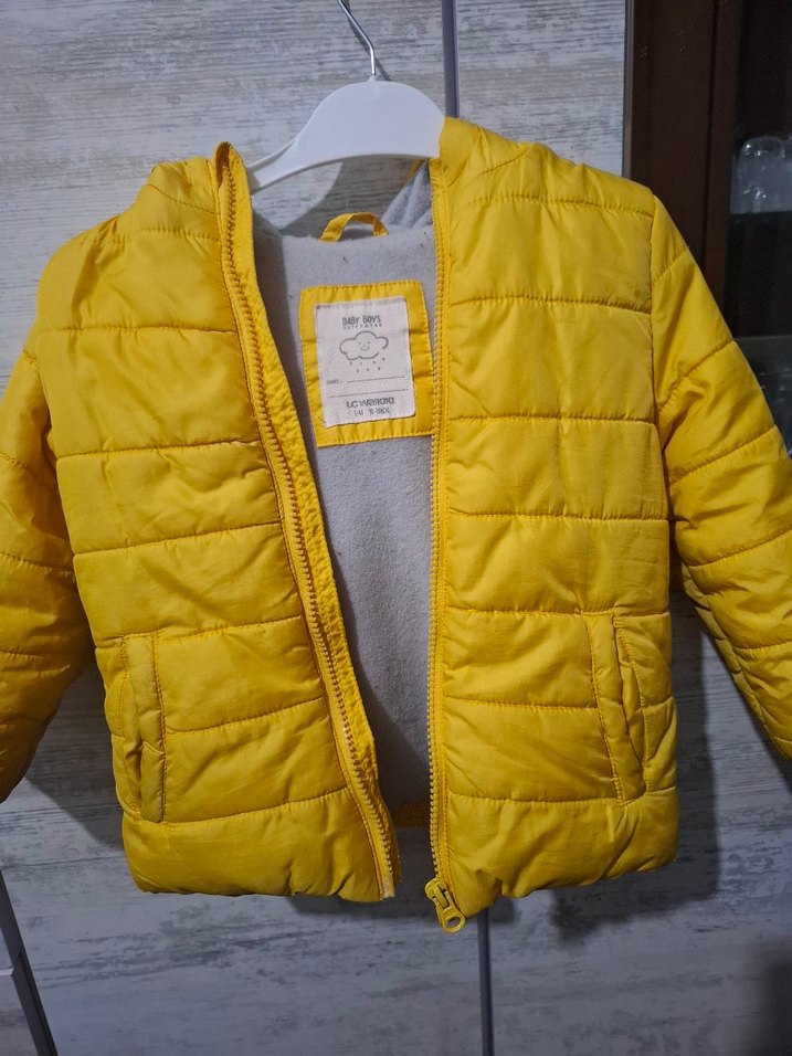 Fermuarlı, bisiklet yaka, sarı renkli, içi yumuşak ve sıcak astarlı erkek çocuk montu. Sokak stili için baskılı ve fit kesim.