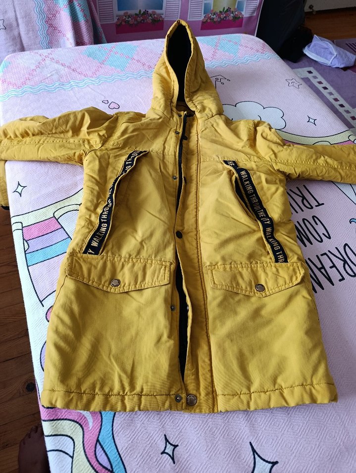 Sarı renkli, kapüşonlu ve fermuarlı ceplere sahip, yumuşak ve sıcak kumaştan yapılmış erkek çocuk montudur. Street wear tarzına uygundur. göründüğü gibi temiz