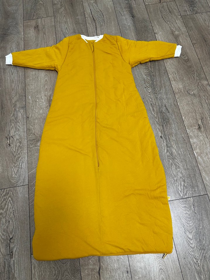 Fermuarlı, uzun kollu ve yuvarlak yakalı, sarı renkli erkek çocuk uyku tulumu.110 cm %100 pamuk