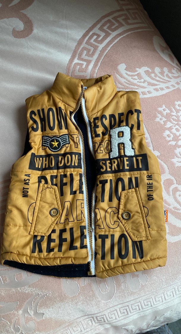 Fermuarlı, parlak sarı renkte, baskılı desenli, yumuşak ve sıcak kumaştan erkek çocuk yeleği. Sokak stiline uygun, kolsuz ve dar kesim.