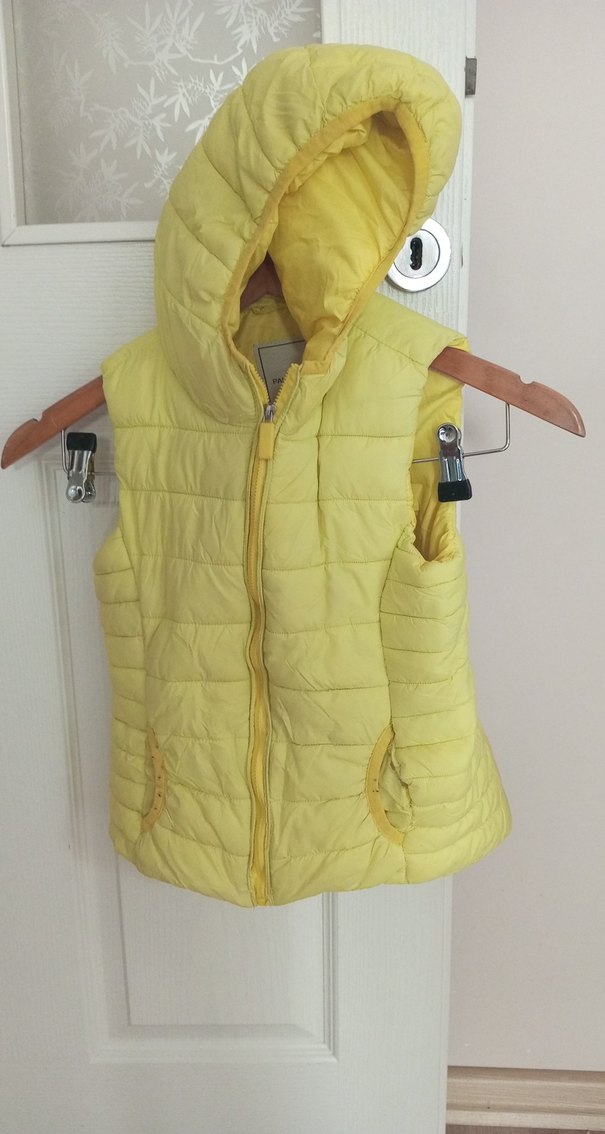 Hafif sarı, kapüşonlu, fermuarlı, erkek çocuk yeleği. Yumuşak ve sıcak kumaştan, rahat sokak stili için uygun.