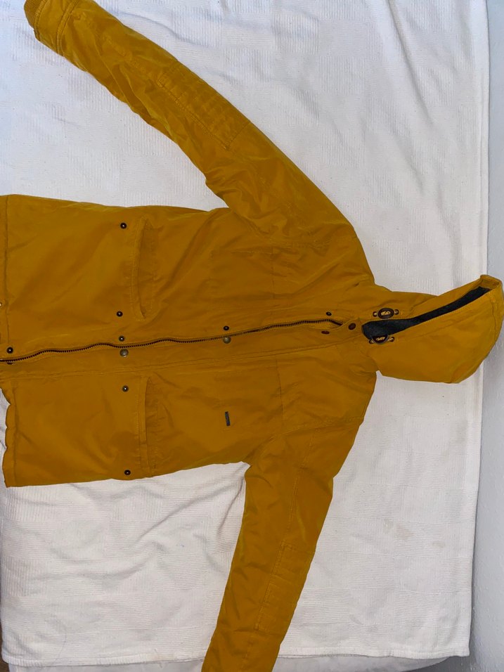 Fermuarlı, uzun kollu ve normal-midi uzunlukta, sarı renkli mont. Parlak yüzeyli, yumuşak ve sıcak kumaştan. Defosu mevcuttur son fotoğrafta gösterilmiştir.