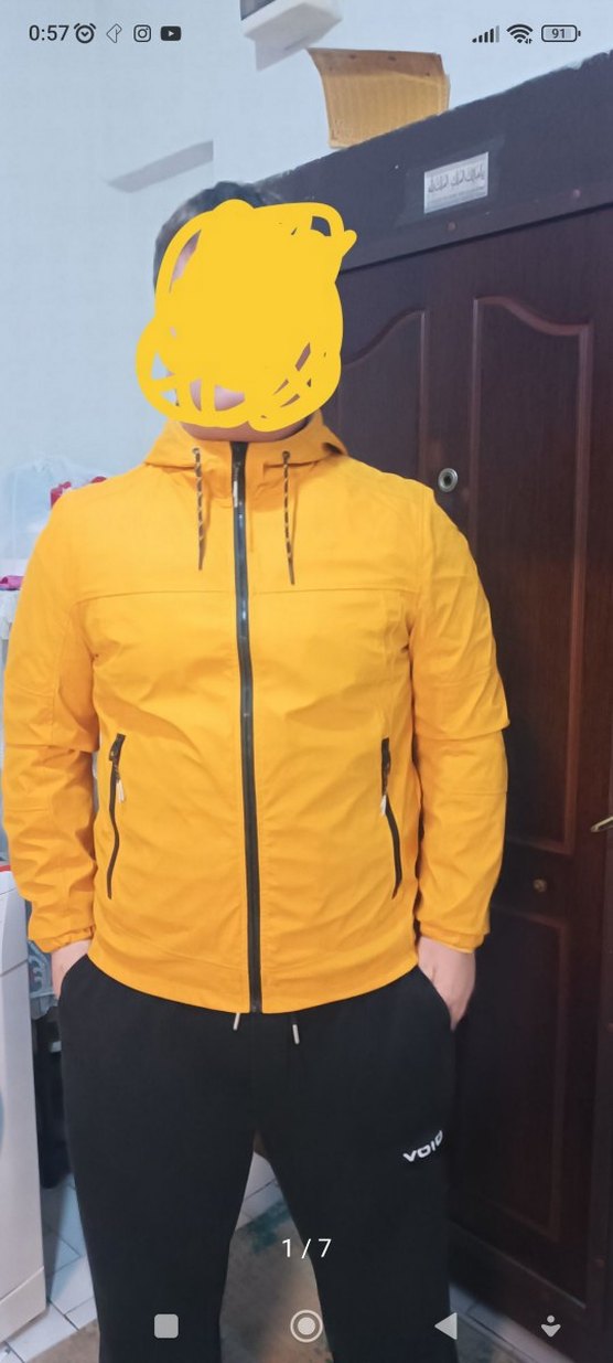 Parlak sarı renkli bu erkek ceket, yüksek yakalı ve uzun kolludur. Fermuarlı cepleri ve önden fermuarı vardır. Spor ve şık görünüm için sentetik kumaştan üretilmiştir. Yağmurluk