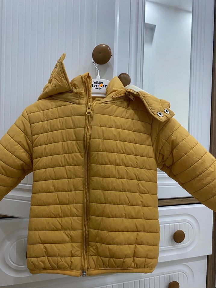Ünisexs çocuklar için ince kesim, fermuarlı ve açık sarı renkte mont. Yumuşak ve sıcak kumaştan yapılmış, yaka detayı bulunur.