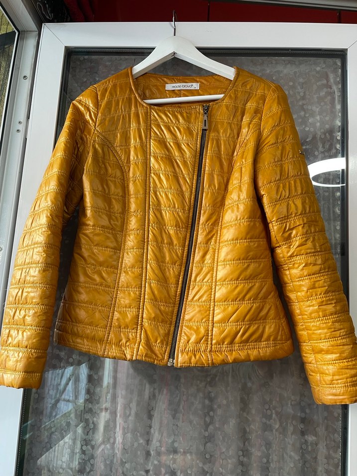 Sarı fermuarlı ceket, çıt detaylı, normal midi boyda, parlak yüzeyli, günlük ve sokak stili için uygun. Göründüğü gibidir fermuarında sorun yok şık
