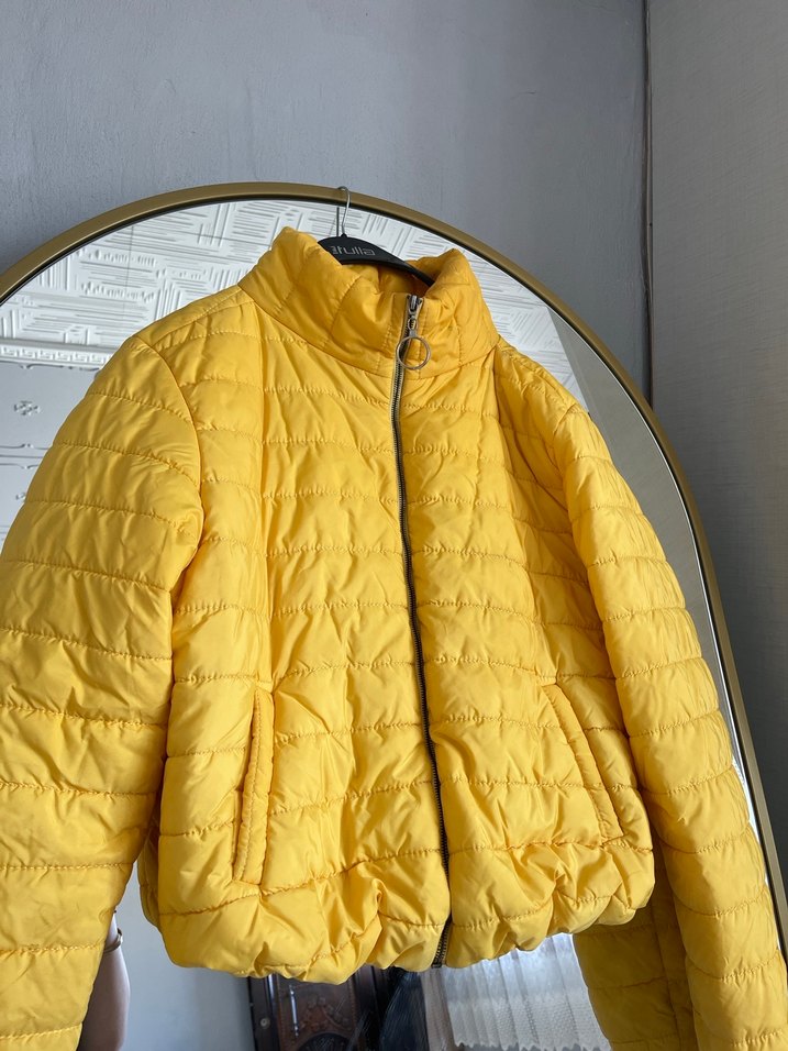 Sarı renkli, fermuarlı ve yüksek yakalı bu kadın ceketi, sentetik parlak kumaştan yapılmıştır. İnce kesimi ve midi boyu ile günlük rahatlığa uygundur.