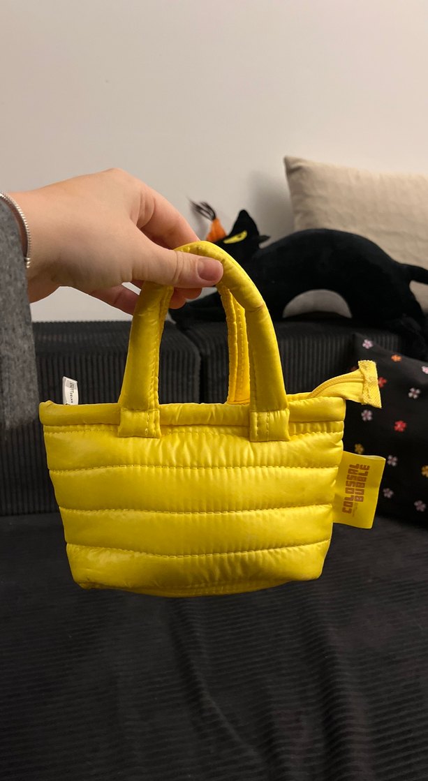 Canlı sarı renkte, fermuarlı ve yumuşak dolgulu dokusu olan kadın el çantası. Sokak modasına ve minimalist tarza uygun, günlük kullanıma ideal.