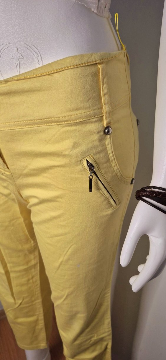 Sarı, parlak sentetik kumaştan yapılmış, fermuarlı cepli, normal boy, dar kesim kadın pantolon.