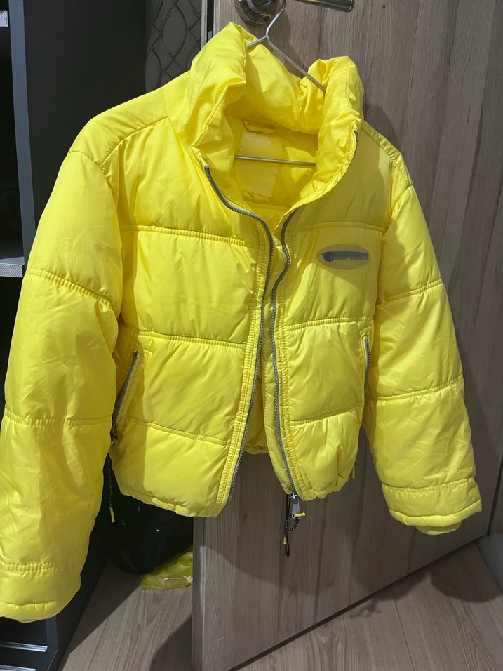 Fermuarlı, yüksek yakalı ve uzun kollu sarı mont, parlak ve rahat dokusuyla midi boyda, günlük sokak stiline uygun.