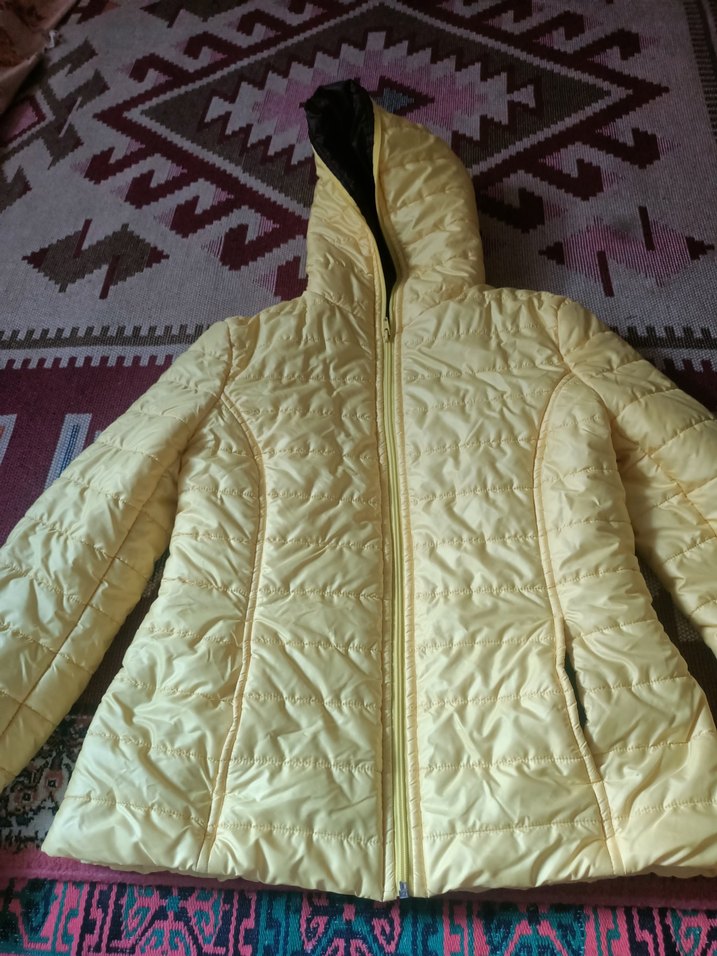 Fermuarlı, uzun kollu, sarı parlak renkte, normal boyda, kesimli kadın mont. Rahat ve günlük kullanım için uygundur.