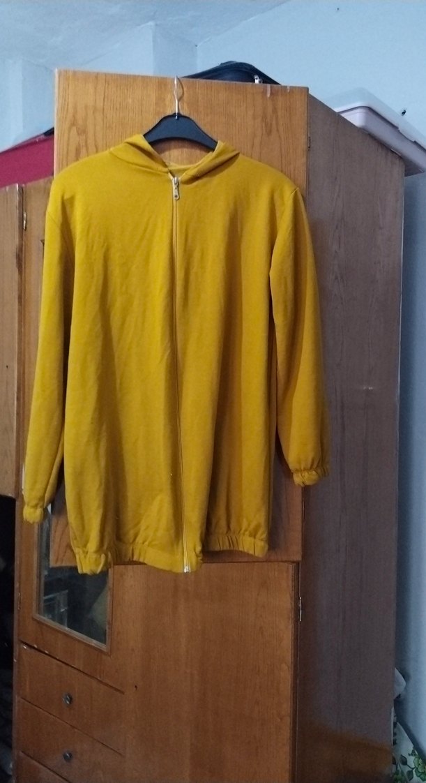 Sarı renkli, fermuarlı, uzun kollu ve bol kesim kadın sweatshirtü, normal midi boyda ve yuvarlak yakalıdır. Yumuşak ve sıcak kumaştan üretilmiştir, rahat günlük kullanım için uygundur. l beden