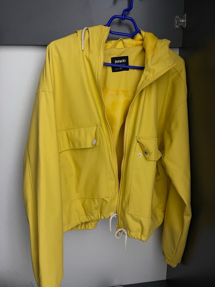 Fermuarlı ön ve uzun kollu, bol kesim sarı ceket. Çentikli yakalı ve parlak görünümlü, günlük sokak stili için uygun. Çok az giyildi bedeni olmadığı için satılıktır. Herhangi bir deformesi yok.