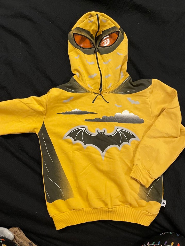 Sarı renkli, fermuarlı kapüşonlu ve yüksek yakalı, uzun kollu, baskılı yarasa desenli erkek sweatshirt.