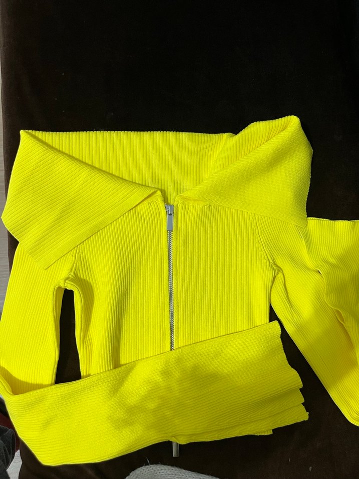 Sarı, Hiç giyilmedi zara kayık yaka hırka S bedenede rahat oluyor fermuarlı, uzun kollu, kısa kesim, fitilli kadın kazak. Yumuşak sentetik kumaştan, boğazlı ve sokak stili için uygun.