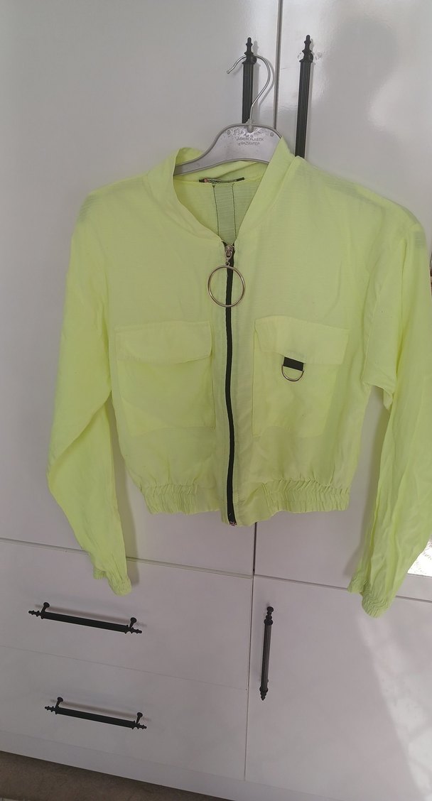 Sarı kısa kadın ceketi, bol kesim, uzun kollu ve yuvarlak yakalıdır. Fermuarlı ve hafif sentetik kumaştan üretilmiştir. Ön cepleri ve lastikli beli bulunur.