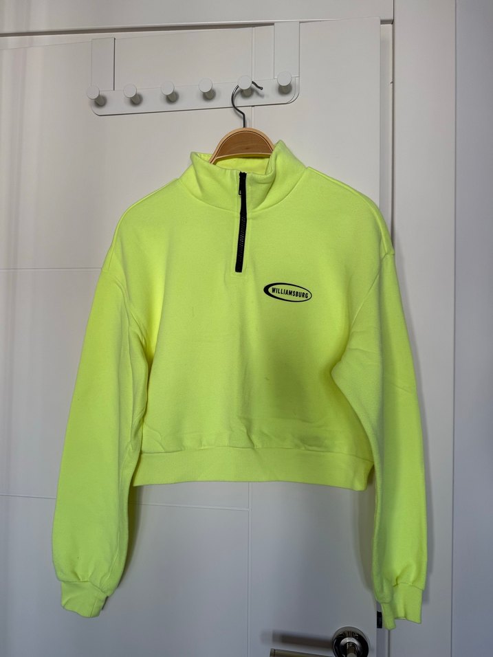 Fermuarlı yüksek yakalı, uzun kollu ve baskılı detaylı sarı, kısa kesim, kalıplı sweatshirt. Rahat sokak stili için uygun. #divided