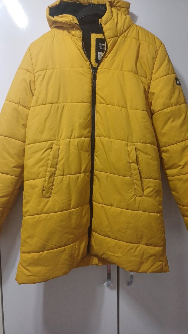 Sarı renkli, fermuarlı kışlık mont. Notlu yaka, uzun kollu ve midi boyda, yumuşak sentetik kumaştan üretilmiştir. Parlak ve desensiz, şık ve rahat tarzda tertemizdir sorunsuzdur.
