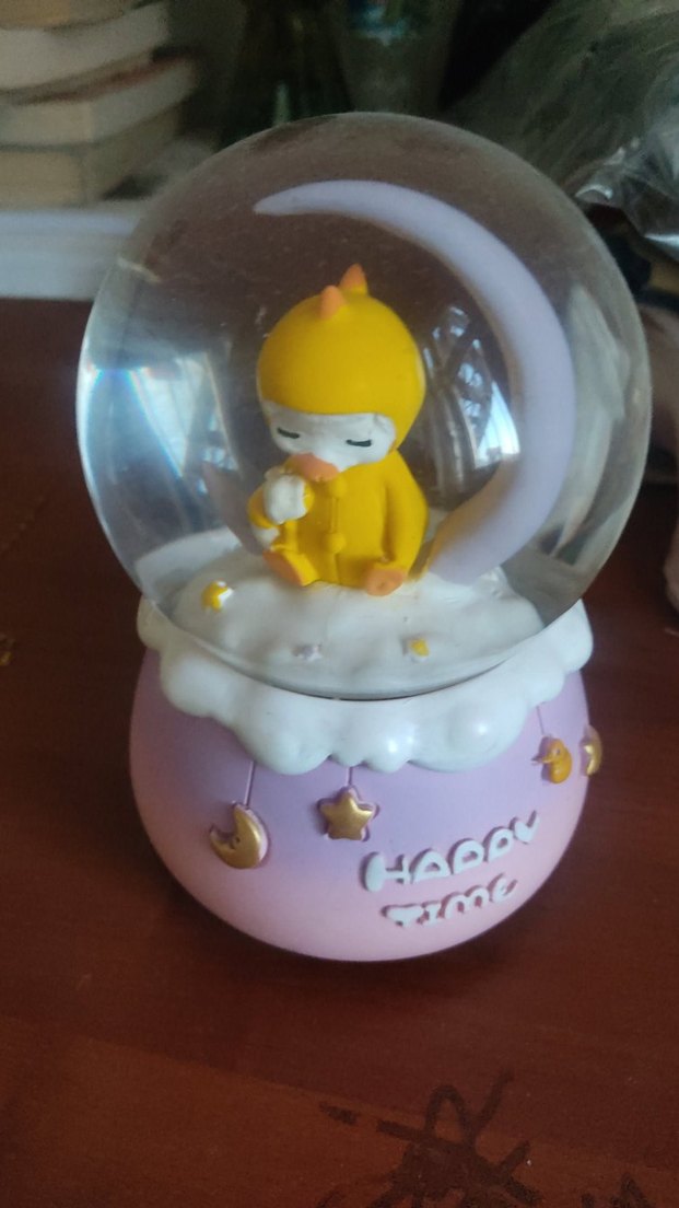 Renkli, sarı figürlü kar küresi, hilal ay üzerinde oturan figür ve 'Happy Time' yazılı taban içerir.