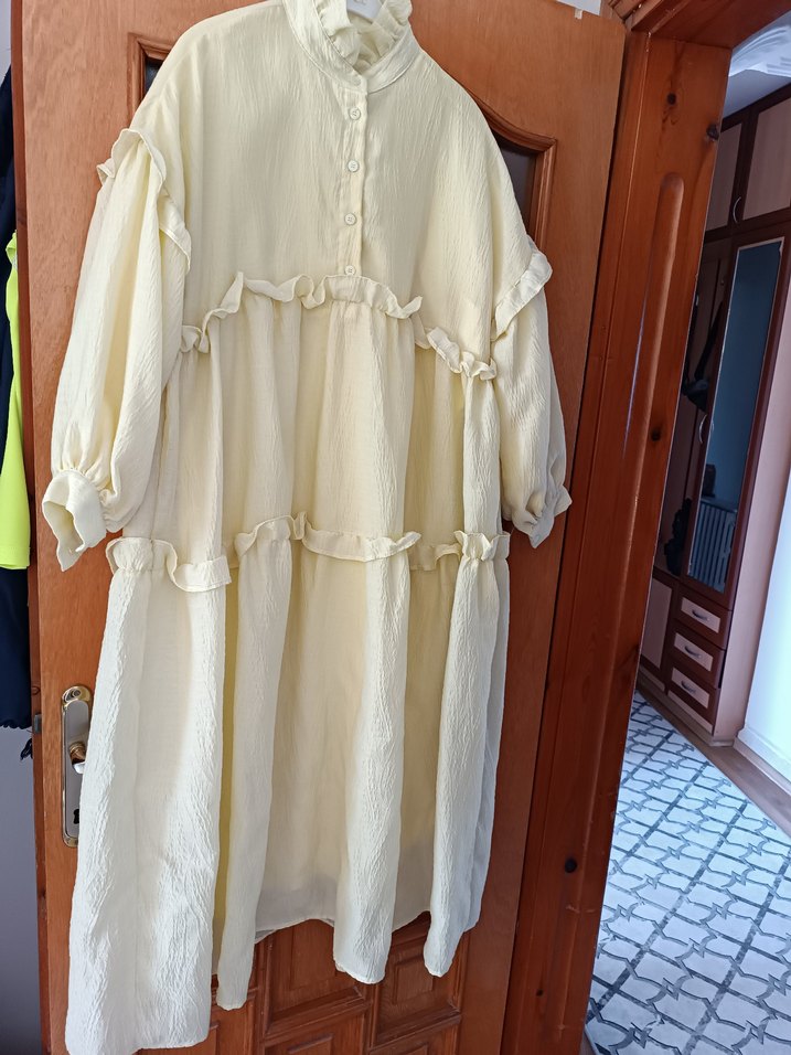 Sarı oversize standart beden fırfırlı astarlı elbise 3 defa kullanıldi temiz sorunsuz boyu 120 cm dir