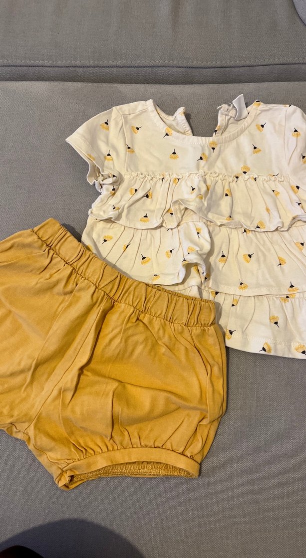 Açık sarı renkte, kısa kollu ve fırfırlı bebek kız takımı. Üstü desenli, yanında uyumlu sarı şort bulunur.