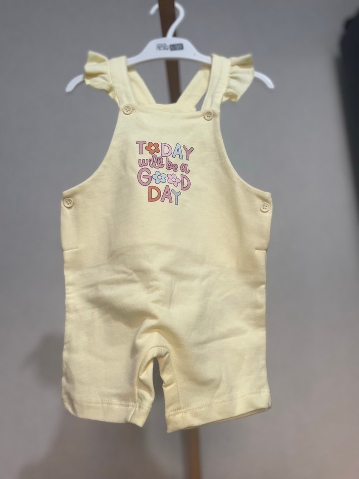 Yumuşak pamuklu, sarı renkli, fırfır detaylı, salaş kesim bebek kız tulumu. Önde renkli baskılı yazı bulunur.