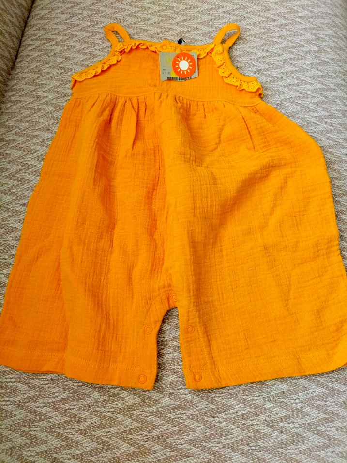Etiketli müslin tulum yumuşak kumaştan, ayarlanabilir askılı ve fırfır detaylı sarı bebek kız tulumu.