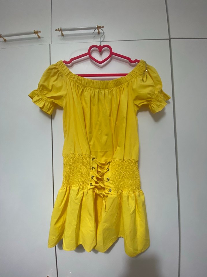 Sarı, fırfırlı ve straplez kollu, bel kısmı bağcıklı, sentetik kumaştan bohem tarzı kız elbisesi.