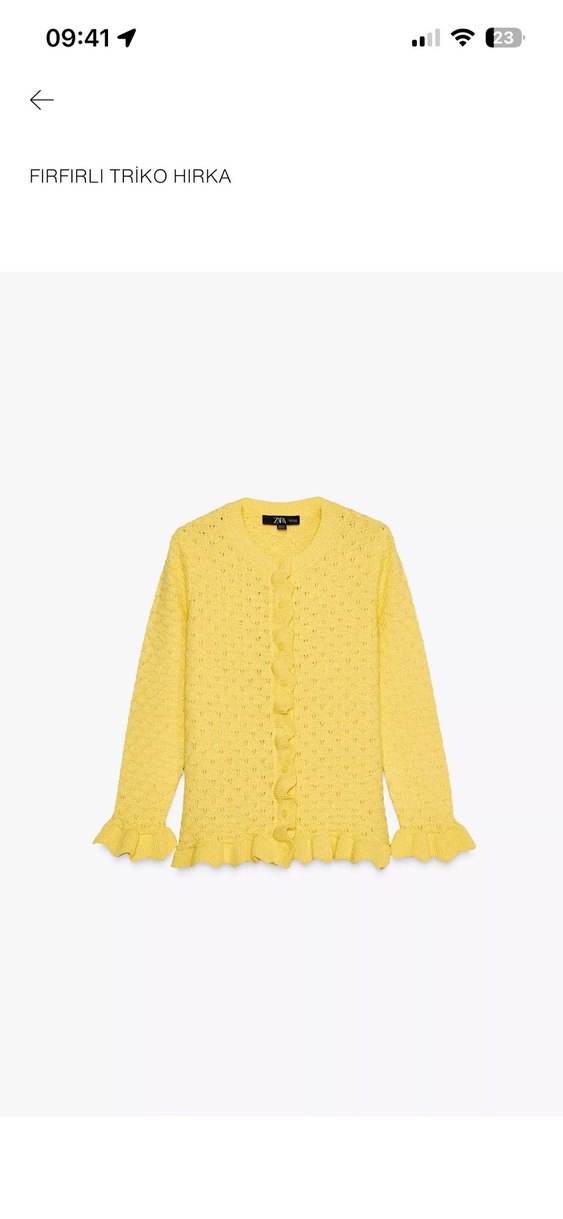 Sarı renkli, uzun kollu, fırfır detaylı triko hırka. Yuvarlak yaka ve normal kesimle, nakışlı desenleriyle rahat ve şık bir günlük kullanım ürünü.