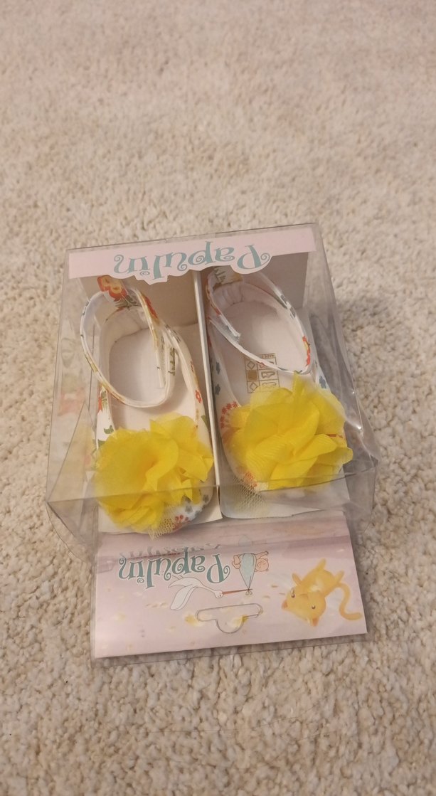 Sarı fırfırlı ve çiçek baskılı desenli kız bebek ilk adım ayakkabısı. sıfır paketlidir. hediye edilmeye de uygundur. Marka: Papulin.