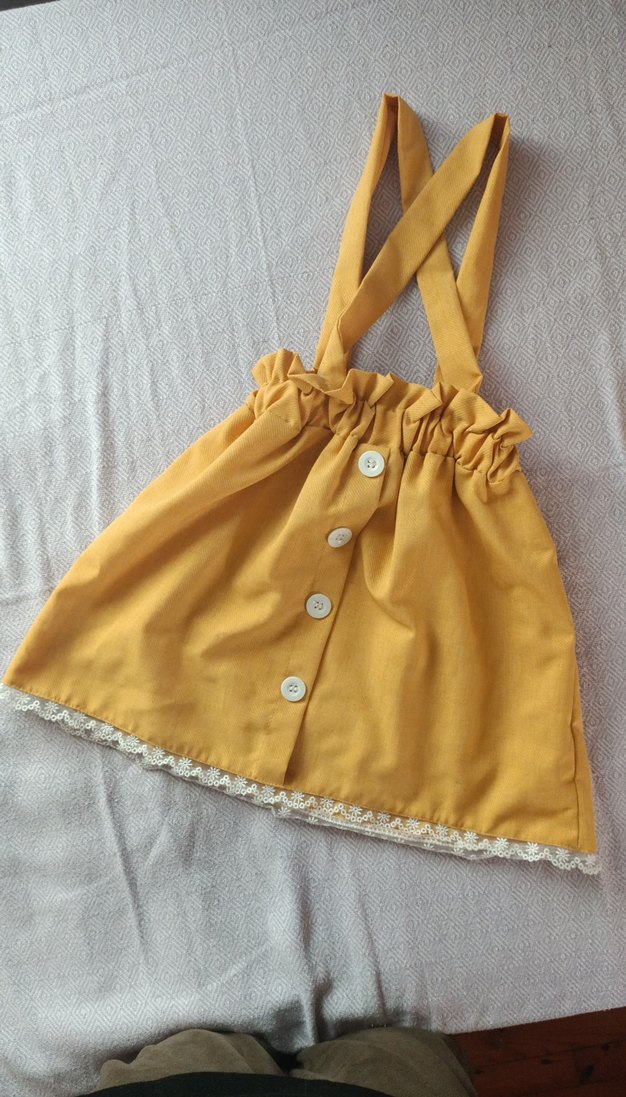Düğmeli, fırfırlı beli ve dantel detaylı sarı renk kız çocuk elbisesi. Askılı ve yumuşak dokulu kumaştan yapılmıştır.