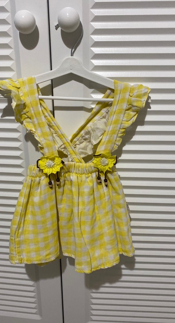Sarı renkli, bol kesim kız çocuk elbisesi, askılı ve fırfırlı detaylı,bohem tarzda.