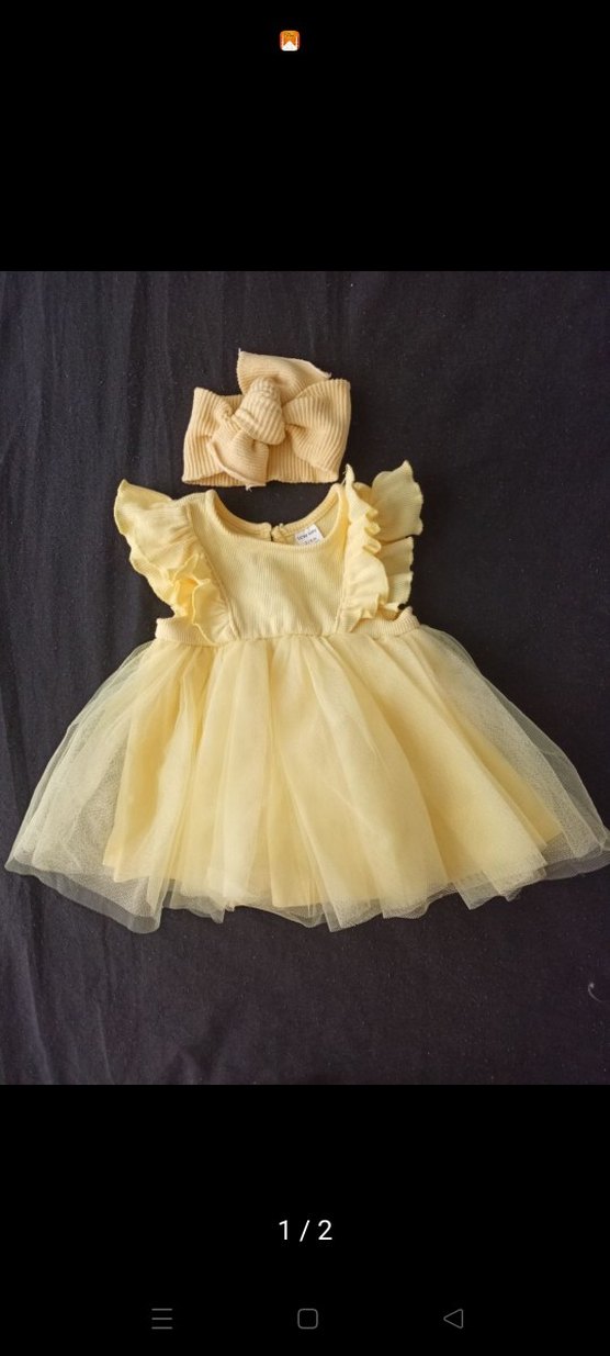 Yumuşak sentetik kumaştan yapılmış, fırfır detaylı ve beli oturan kollarsız sarı kız çocuk elbisesi. Eşleşen saç bandı dahildir.