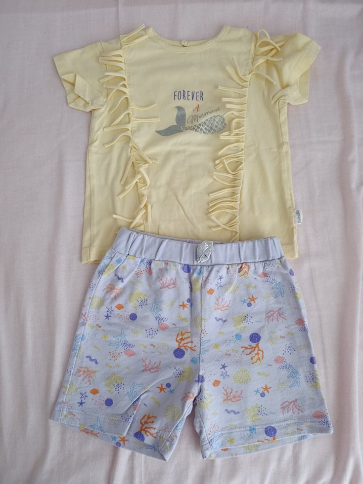 Sarı fırfırlı kısa kollu üst ve pastel desenli şorttan oluşan kız bebek takımı. Üstte "FOREVER" yazısı bulunur.