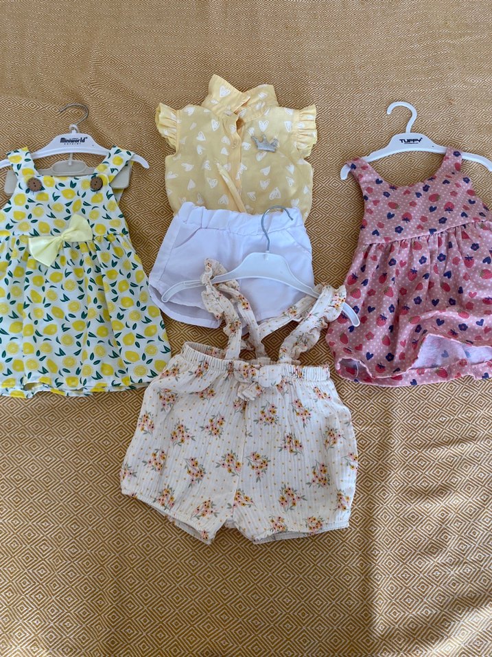 Pastel sarı renkte, bağlama desenli ve fırfır detaylı kolsuz bebek kıyafet takımı. Yumuşak ve rahat kumaş. 6 aydan itibaren olur