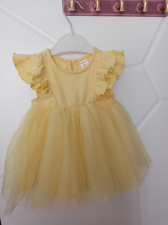 Yumuşak sentetik kumaştan yapılmış, kolsuz, fırfırlı detaylı sarı kız çocuk elbisesi. Bohem tarzda, straplez yakalı ve pastel tonlarda.