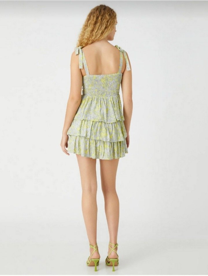 Sarı, bağcıklı askılı, fırfırlı mini elbise. İnce kesimi ve bohem tarzıyla romantik akşamlar için uygundur.