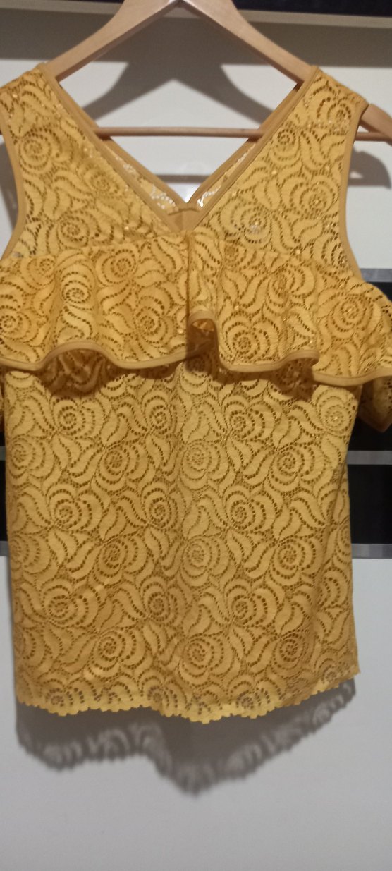 Bu sarı kadın bluz, parlak sentetik kumaş üzerinde nakışlı desenlere ve straplez yaka ile fırfırlı detaylara sahiptir. Kısa uzunluktadır, bohem ve vintage tarzına uygundur.