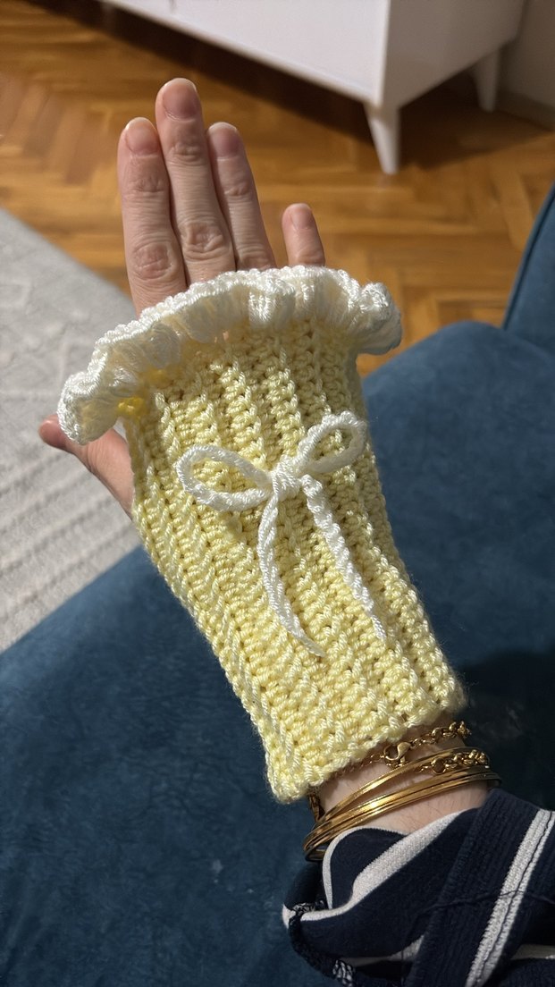 Pastel sarı renkte, yumuşak örgüden yapılmış bohem tarzda kadın eldiveni. Fırfırlı kenar ve fiyonk detayı bulunur.