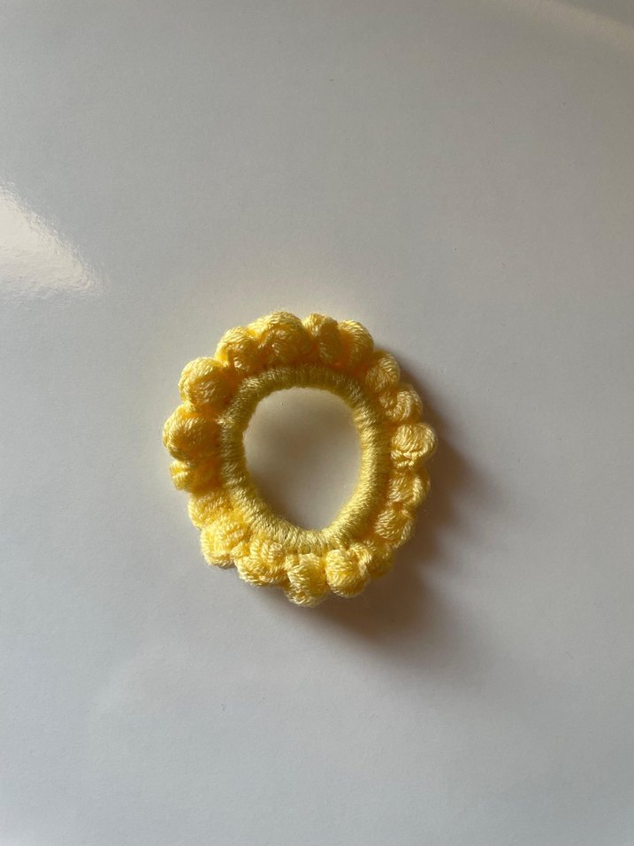 Sarı renkli örgü saç tokası, fırfır detayıyla bohem tarzınıza renkli bir dokunuş katıyor.