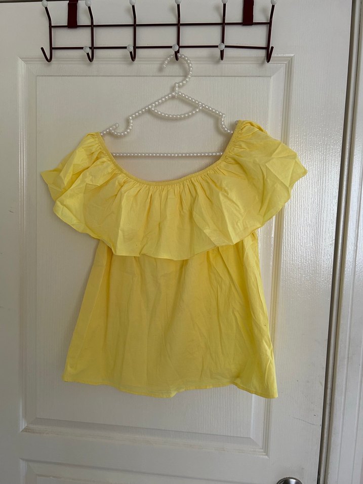 Nefes alabilen keten kumaştan, fırfırlı detaylı, straplez, kısa kollu, mini boy, bol kesim sarı bluz. Bohem tarzı için ideal.