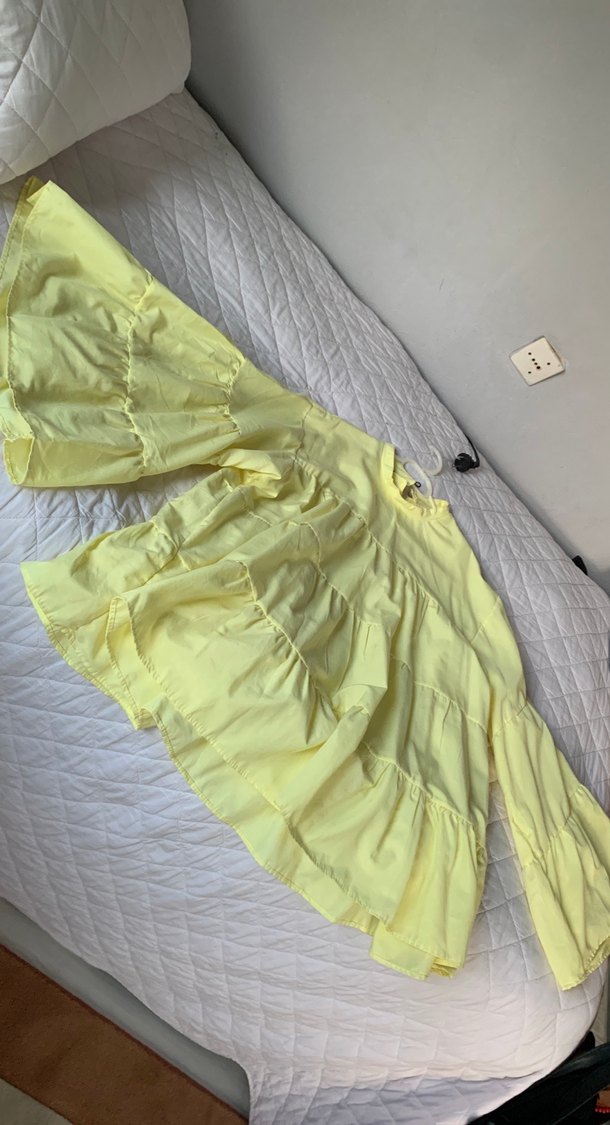 Yumuşak keten kumaştan, uzun kollu ve tek renkli, bol kesim sarı gömlek, fırfır detaylarıyla tamamlanmıştır.