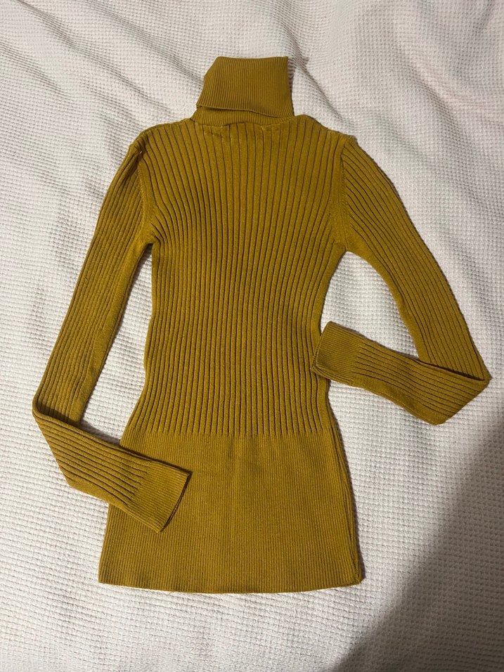 Sarı renkli, boğazlı ve uzun kollu, fit kesim triko kazak. Fitilli dokusu günlük sokak stiline sıcaklık katıyor.