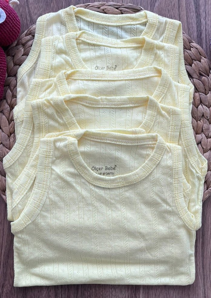 Pastel sarı renkli, kolsuz, yuvarlak yaka ve örme dokulu bebek body. Pamuklu ve rahat kumaş.