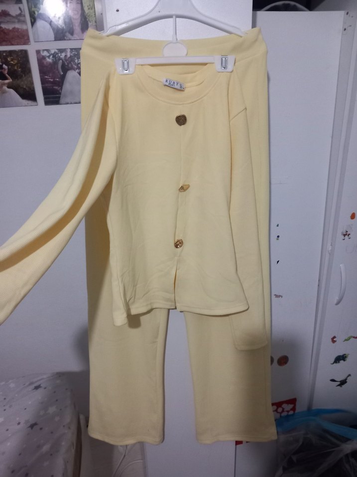 Pastel sarı, uzun kollu, notched lapel yakalı, bol kesim esnek yapıda şık bir takım m ve l bedene uygun