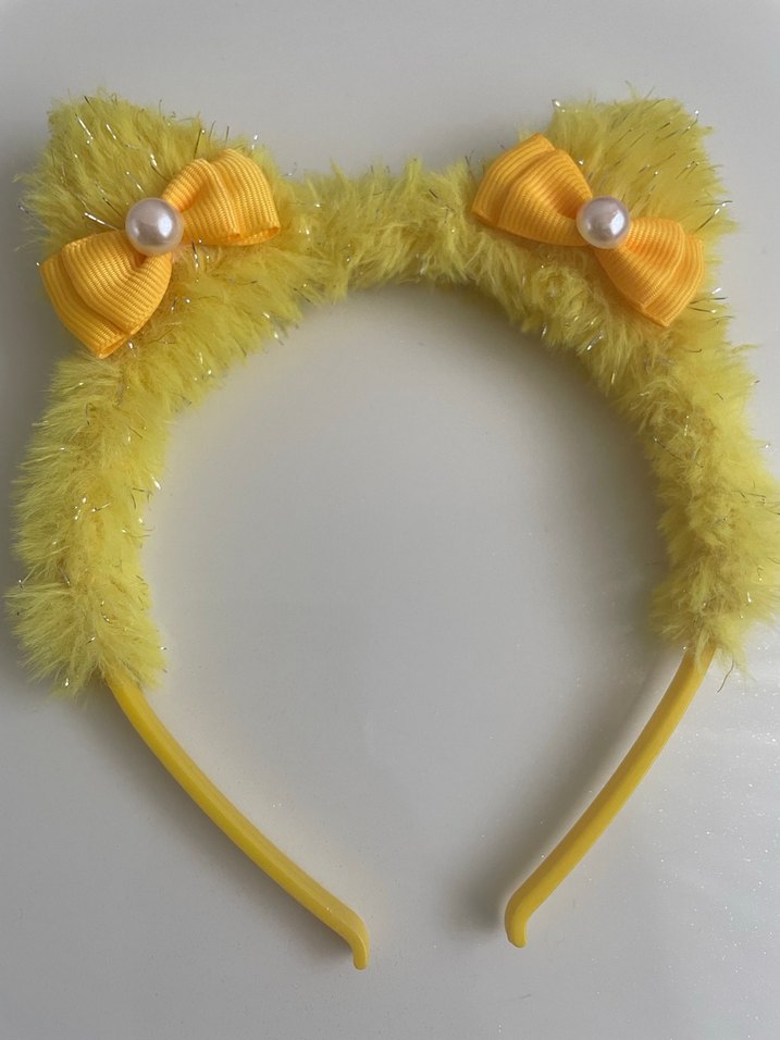 Sarı renkte, yumuşak tüylü dokusu ve işleme detayları olan çocuk saç bandı, incili iki fiyonk ile retro ve bohem tarzını yansıtıyor.
