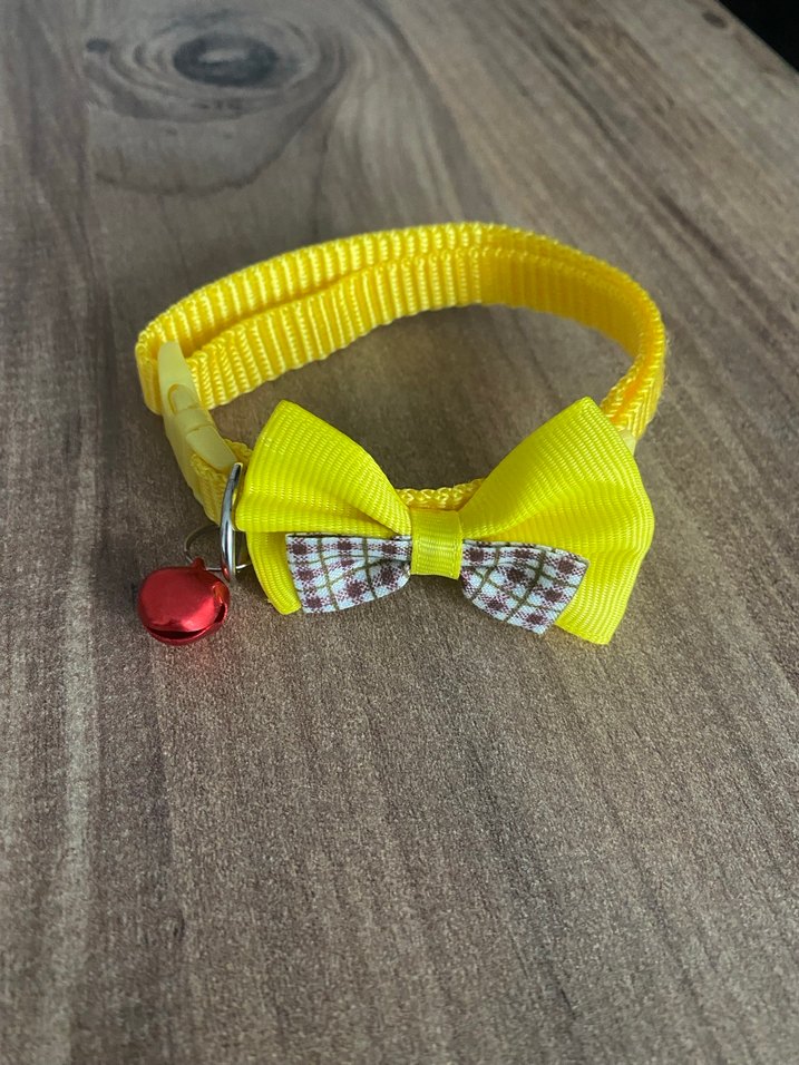Ayarlanabilir, sarı renkte fiyonklu ve küçük kırmızı zilli kedi tasmasıdır. Sıfır ürün