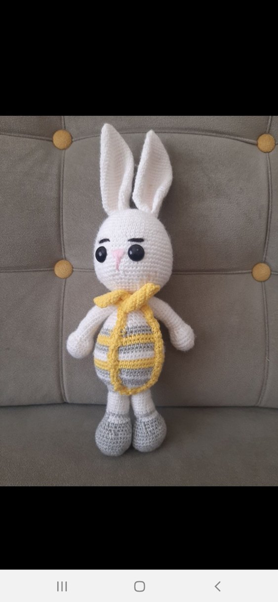 Uzun kulaklı beyaz peluş tavşan, açık sarı fular takıyor. Yumuşak tığ işi dokusu, gri ayaklar ve çizgili karın kısmı bulunuyor.