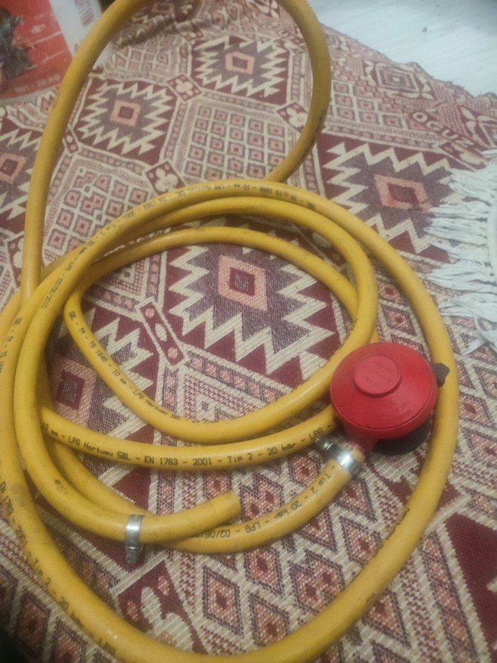 Sarı gaz hortumu ve kırmızı regülatör, güvenli gaz bağlantısı ve kontrolü için tasarlanmıştır. Esnek ve dayanıklı yapıdadır.