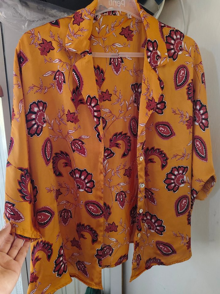 Gevşek kesim, yakalı ve kısa kollu kadın gömleği. Hafif sarı tie-dye desenli ve şeffaf, ipeksi kumaştan midi boyda. Bohem tarzı yansıtır. s,m için uygundur