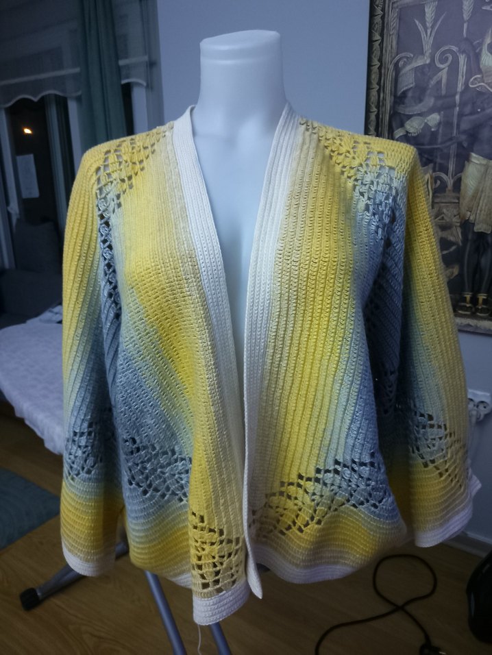 Sarı ve gri bağlamalı desenli, uzun kollu, tekne yaka, bol kesim örgü kadın hırka. Rahat ve midi boyda, günlük kullanıma uygun. Sevdiğiniz renk tonlarında sipariş alıyorum.Afresinize gönderiyorum.